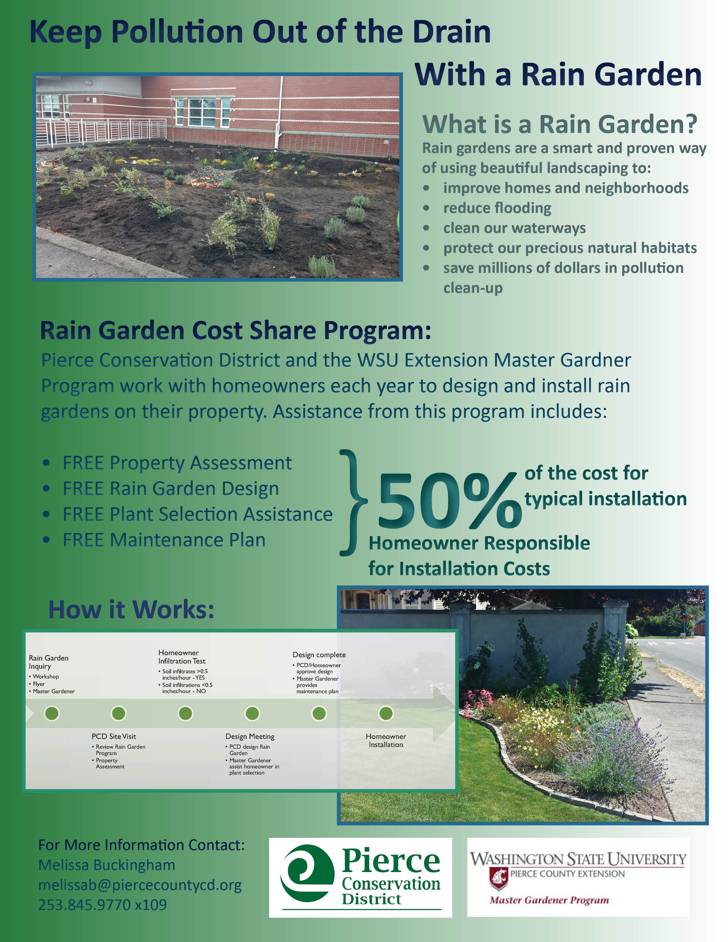 Did you know that the District has a Rain Garden Cost Share Program? The District and the WSU Extension Master Gardner Program work with homeowners each year to design and install rain gardens on their property. Assistance from this program includes: